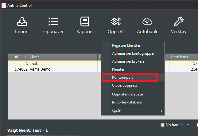 In Aritma Control for Visma Business and Global, during setup you will find the account import menu. This makes it possible to fetch an account from another client and reconcile against an account from the client you are active on. Note that you must be on the client where you want to create the account group, and then create a link to the client where the other account resides. It can be useful for reconciling intercompany balances or customer/supplier relationships across two different clients.