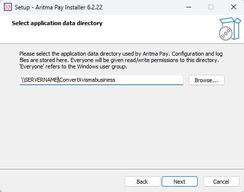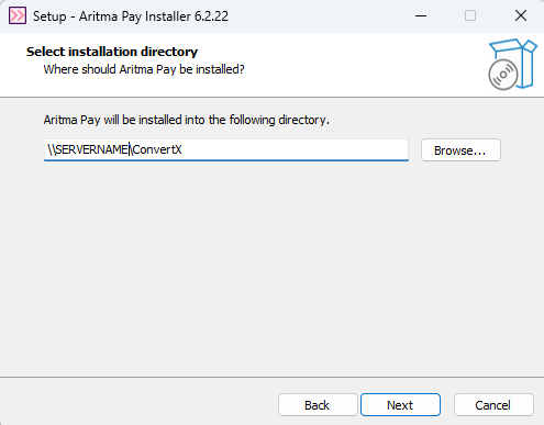 5. Select where Aritma Pay or Aritma Control should be installed. Use UNC file-path. See example: \\SERVERNAME\AritmaPay.
