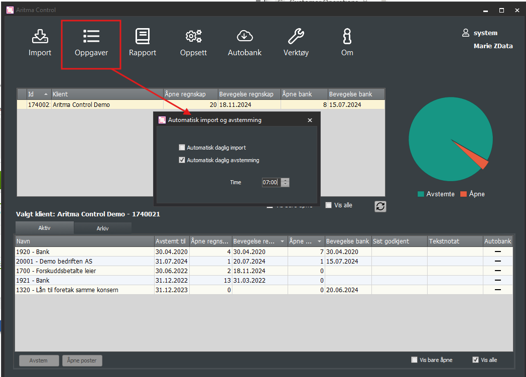 Aritma Control can be configured to automatically reconcile every day at a desired time. You can enable automatic reconciliation by selecting "Tasks" in the overview screen.