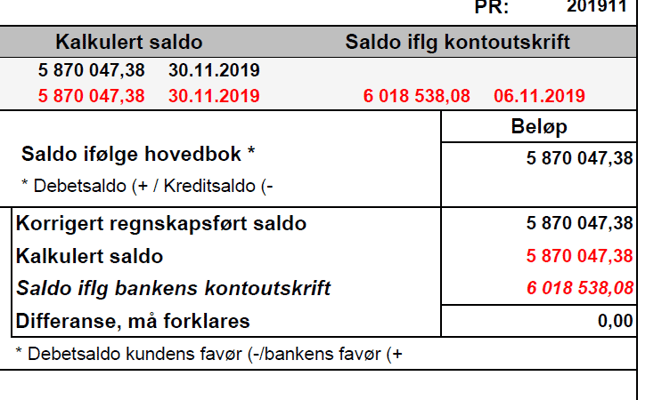 If there is a difference between these two amounts, it will be marked in red on the reports. The difference can be due to missing or duplicate transactions, or different dates on the balances being compared. In the example below, you can see that the calculated balance has the date 30.11.2019, while the balance according to the bank statement has the date 06.11.2019. The balances are compared at different times, which causes a difference.