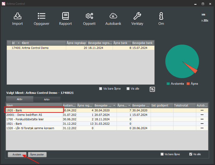 For å starte avstemming høyreklikker du på kontoen du vil avstemme eller trykker på knappen "Avstem".