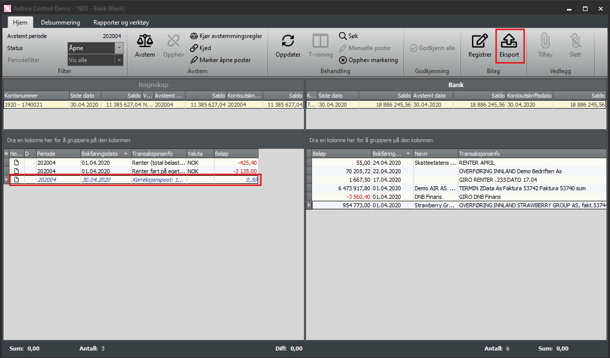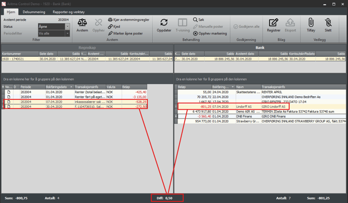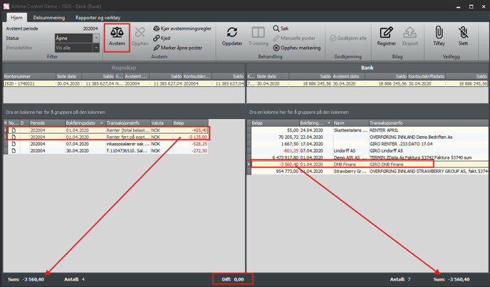 Programmet beregner løpende de markerte postene. Differansen viser på midten nedert i visningen. Kontroller at differanse mellom valgte poster er null. Trykk så "Avstem" eller CTRL+A.