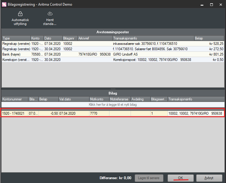 Programmet foreslår at det registreres en korreksjonspost slik at differanse blir null.
