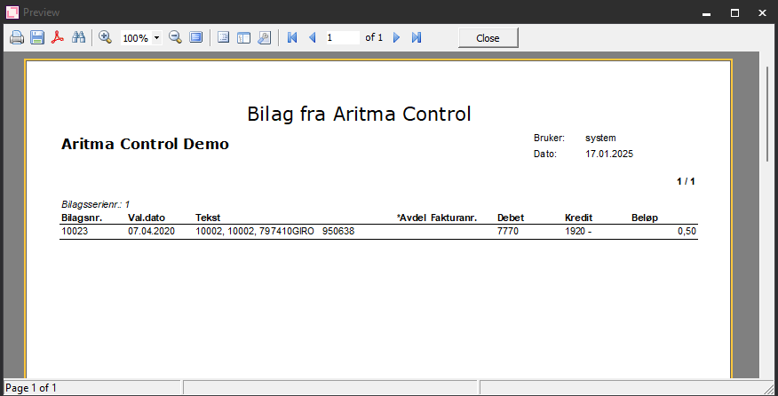 Dersom man har Control som er integrert i regnskapet vil det nå ligge et bilag klar til å oppdateres. For versjoner som ikke er integrert kan vi lage en fil som kan importeres til regnskapet basert på mal fra regnskapssystem. Ta kontakt med Aritma for mer informasjon.