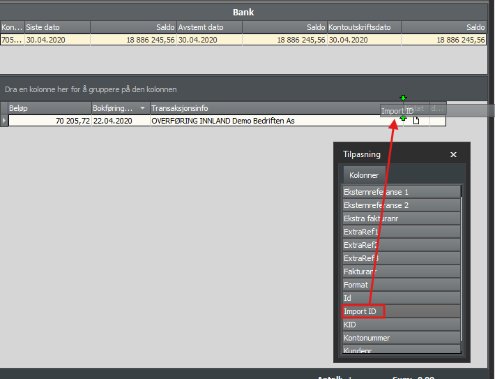 Med Import ID kolonnen fremme kan du notere ID på transaksjonen(e) du ønsker å oppheve import på.