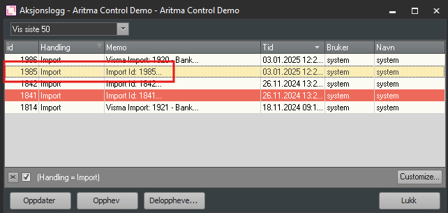 I aksjonslogg Kan du søke på denne ID'en og oppheve importen