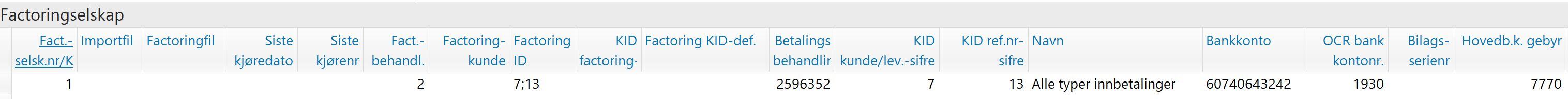 I tabellen "Factoringselskap" må alltid "Fact.behandl." settes til 2 (OCR / KID definisjon) og kontonummer fylles ut under "Bankkonto" (bankkonto må skrives likt som på innbetalingene, altså enten som BBAN eller IBAN på factoringlinjen, og uten punktum eller mellomrom). I tillegg skal KID-ref.sifre og KID kunde/lev.sifre fylles ut. KID/ref.sifre er lengden på fakutanummer, og KID kunde/lev.sifre er lengden på kundenummer. Også "OCR bank kontonr." og "Hovedbok k. gebyr" må fylles ut.