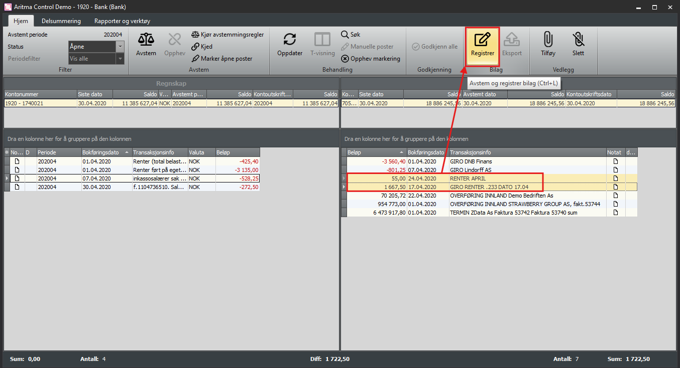 I skjermbildet under er det kommet inn renter på konto som ikke er bokført i regnskapet. Ved å markere postene og trykke på Registrer vil man få opp vindu for bilagsregistrering.