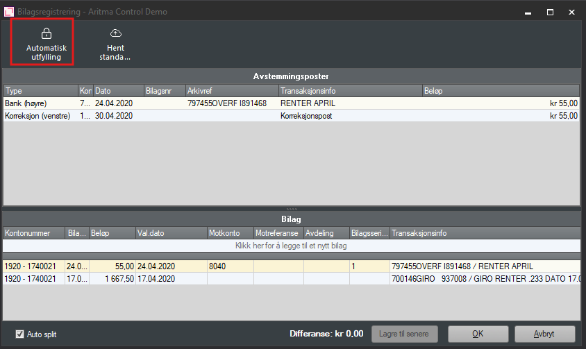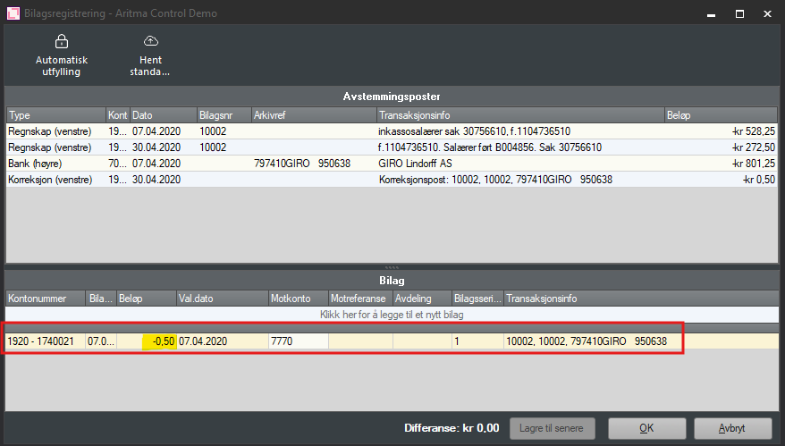Dersom man har poster som skal avstemmes mot hverandre, men som ikke blir 0, kan man opprette bilag som fører differansen på postene. Marker postene som skal avstemmes og trykk avstem. Når det er en differanse vil Control åpne bilagsregistreringen og man kan velge hvordan differansen skal føres. I skjermbildet under er det en differanse på 0,50 kr