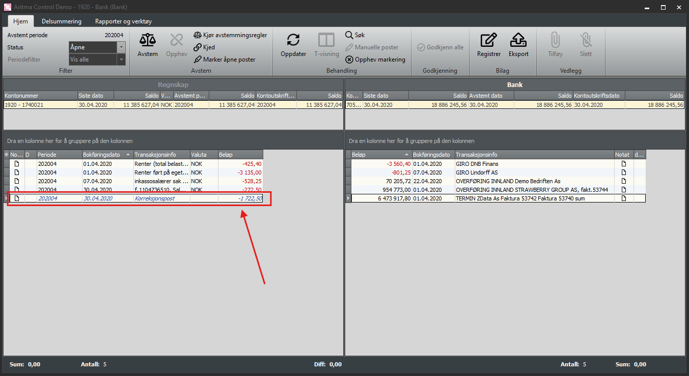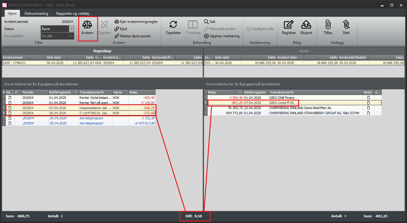 Postene avstemmes og en korreksjonspost på 0,50 kr opprettes.