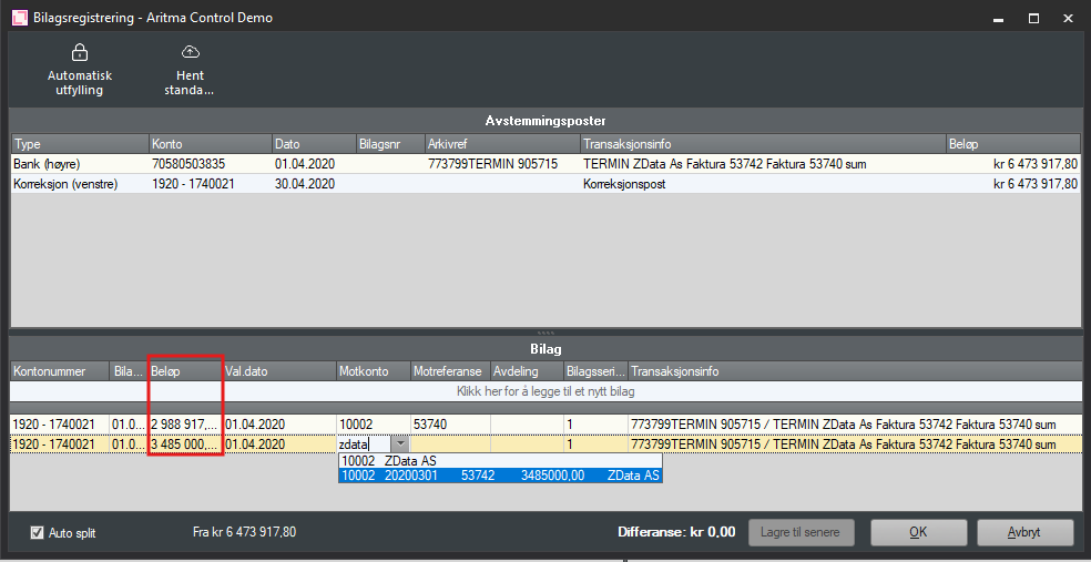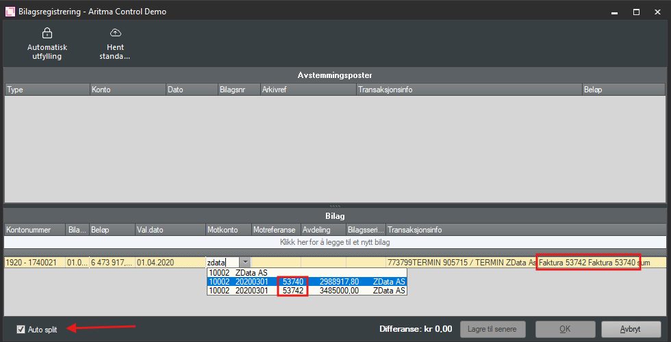 Man kan også splitte en transaksjon, f.eks. dersom det er en innbetaling som gjelder flere fakturaer. I skjermbildet under er det kommet en innbetaling som skal splittes på to åpne poster på kunden. Ved å ha hake på Auto split (nede til venstre) kan man dele opp innbetalingen slik at begge postene blir utlignet.