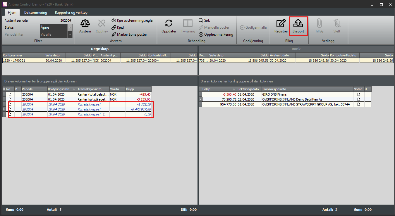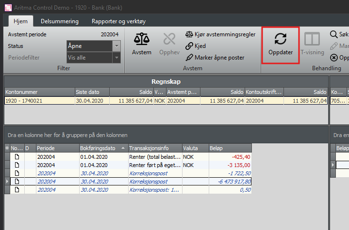 Når dette er gjort, gå tilbake til Control og trykk på "Oppdater". Kontroller at saldo nå stemmer. Dersom saldo ikke skulle oppdatere seg, forsøk å lukke avstemmingsvinduet og åpne det på nytt.