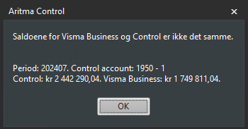 Aritma Control sammenlikner kalkulert saldo i Control med saldo i samme periode fra tabellen hovedbokssaldo i Visma Business. Ved å sammenligne en kalkulert saldo med en som er gitt fra Visma Business får man en sjekk på at alle bilag/transaksjoner har kommet over til Control og at ingen ligger dobbelt. Dersom disse saldoene ikke stemmer så varsler Control om dette ved følgende melding: